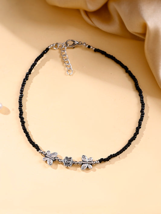 Silver- Plated Beads Black Thread Anklet For Women & Girls