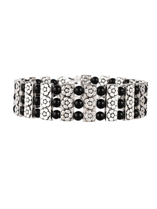 Womn Black & Silver Brass Cuff Beaded Bracelet