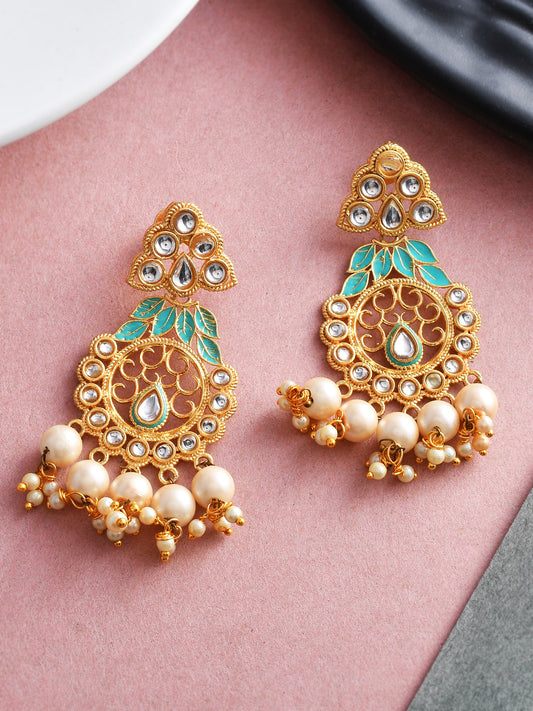Gold Plated Circular Studded Long Chandbali Enamelled Drop Earrings