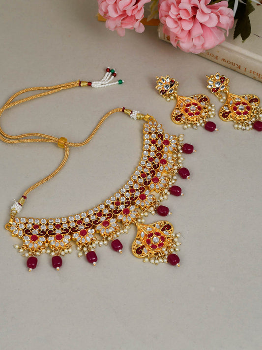 Red & White Gold-Plated Kundan Handcrafted Jewellery Set