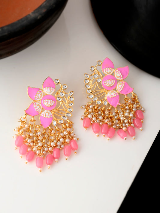 Gold Plated Pink Toned Handcrafted Kundan Studded Floral Drop Earrings