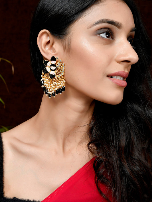 Gold Plated Black Toned Handcrafted Kundan Studded Floral Drop Earrings