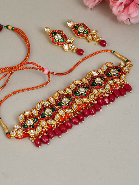 Red Kundan Meenakari Rajwadi Jewellery Set