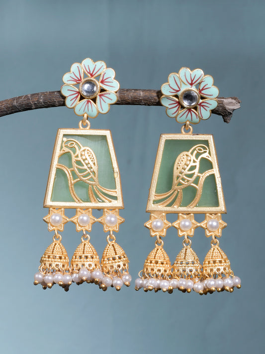 Ethnic Indian Gold Plated Pistachio Meenakari Jhumkas Earrings