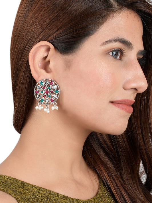 Classic Pink Green Oxidized Filigree Stud Earring For Women