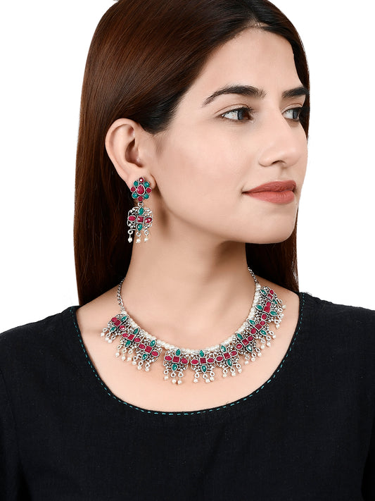 Traditional Green & Pink Stone Stylish Oxidised Jewelry Set