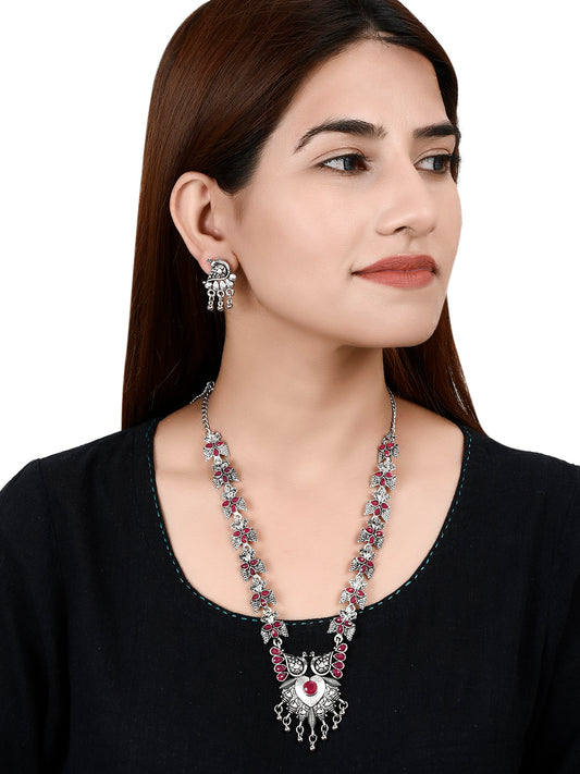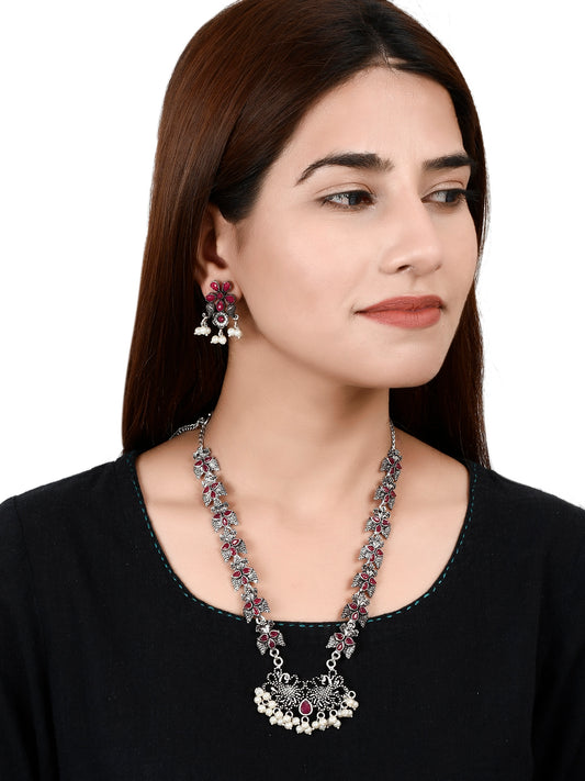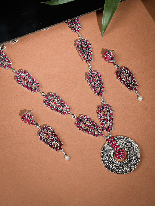 Pink Traditional Oxidized Silver Plated Designer Jewelry Set For Women