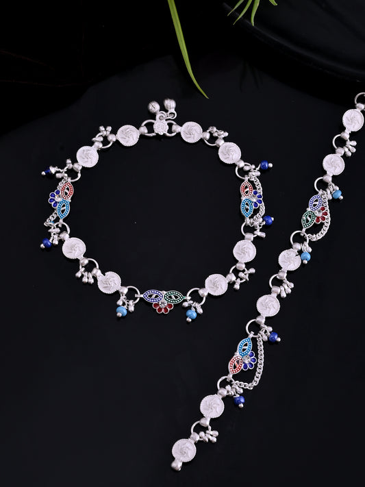 Silver- Plated Coin Anklet With Colorful Bead | Traditional Payal