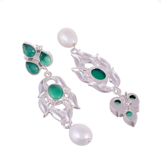 Sterling Silver Green Onyx Pearl Drop Long Dangler Earrings For Women(sme_2522)