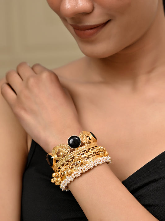 Make a statement with our stunning bangles collection, featuring sleek Gold Plated, Oxidised, Kundan, Pearl, and Silver Bangles. Choose from minimalistic designs to chunky chunky designs to make your wrist look sophisticated.
