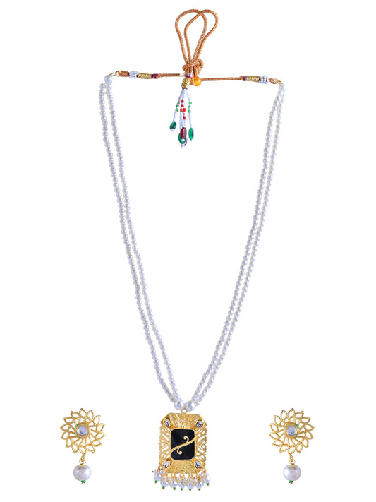 Black & Gold Pearl Beaded Necklace Set with Kundan Pendant and Earrings for Women
