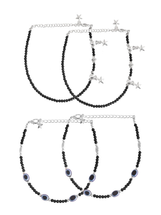 Black Beaded Silver-Plated Adjustable Anklet Set For Women & Girls – Pack of 4 | Ethnic Payal Jewellery