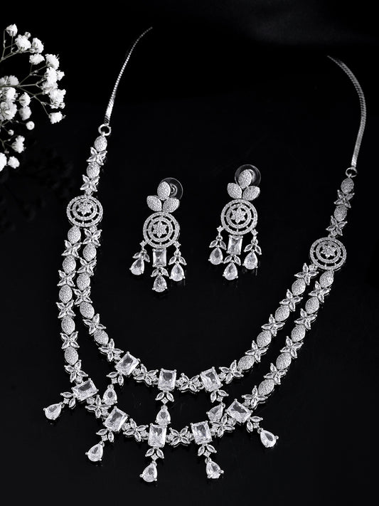 Silver AD Jewellery Set | Wedding Jewellery For Women| Bridal CZ Necklace With Earrings