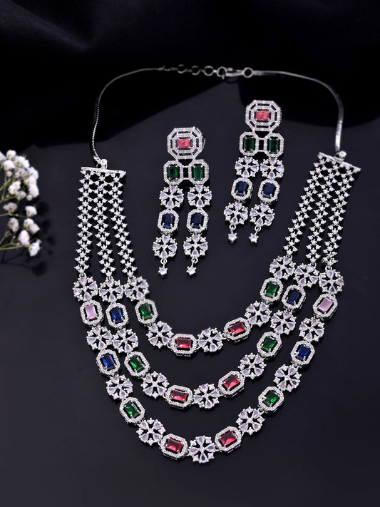 Multi Triple Layer Silver American Diamond Necklace Set | Wedding Jewellery For Women| Bridal CZ Necklace With Earrings