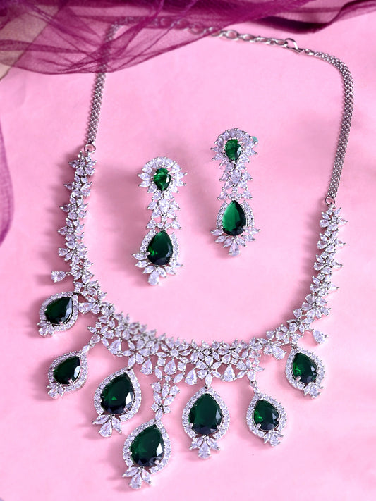 Green American Diamond Necklace Set | Wedding Jewellery For Women| Bridal CZ Necklace With Earrings