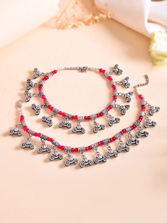 Oxidised Red Beaded Payal For Women | Silver Plated Traditional Anklet Set