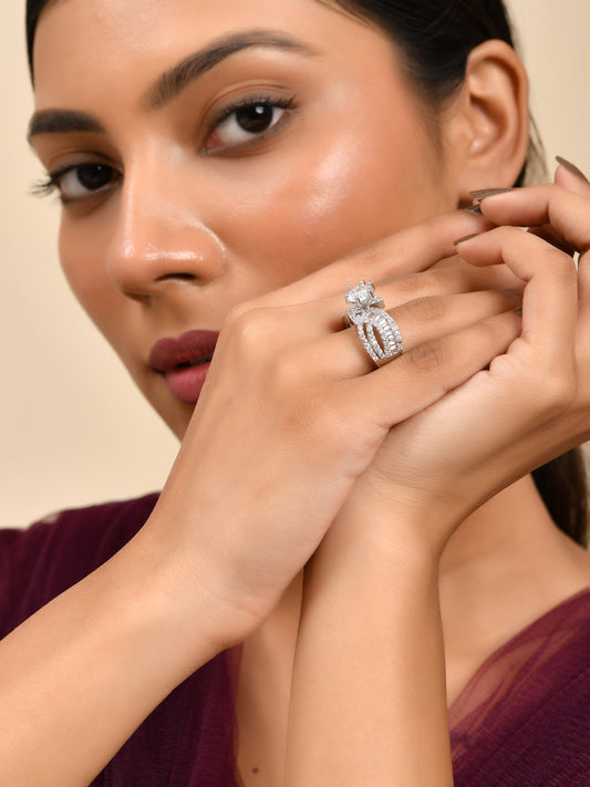 Classic Silver-Plated CZ Cluster Statement Ring For Women | Bridal Jewellery