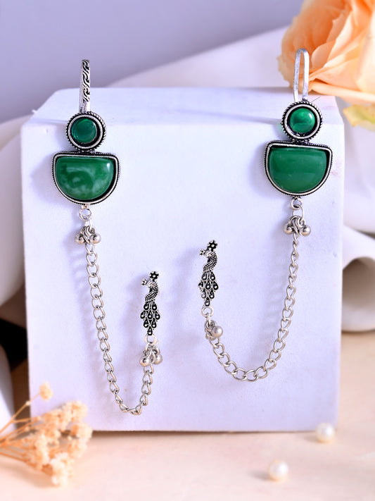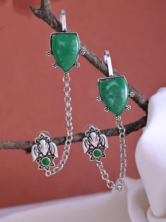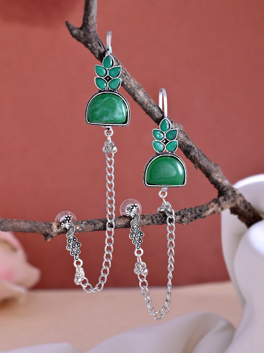 Boho Drop Oxidised Silver Long Chain Earrings With Green Stone For Women
