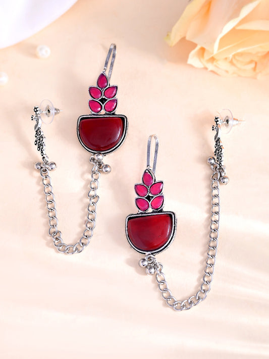 Boho Drop Oxidised Silver Long Chain Earrings With Red Stone For Women