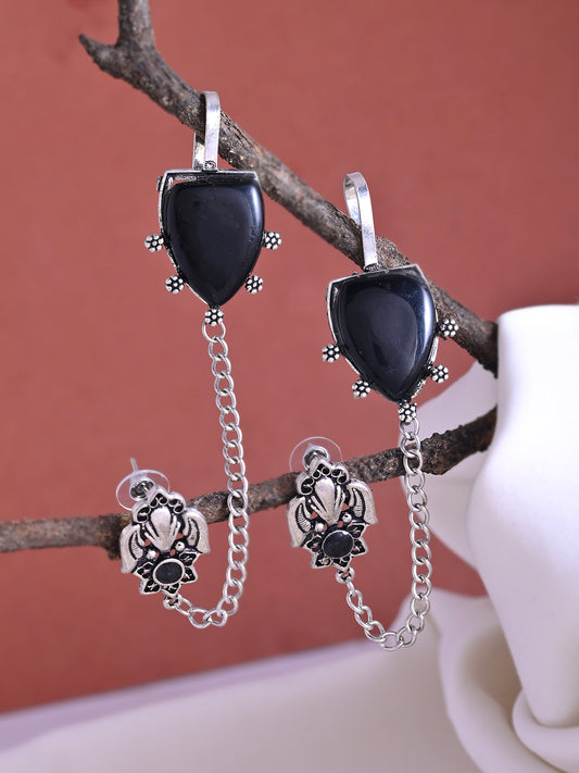 Boho Drop Oxidised Silver Long Chain Earrings With Black Stone For Women