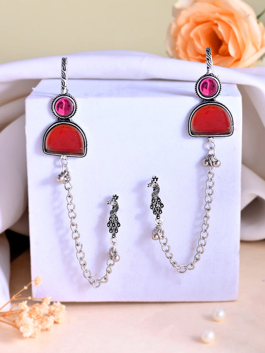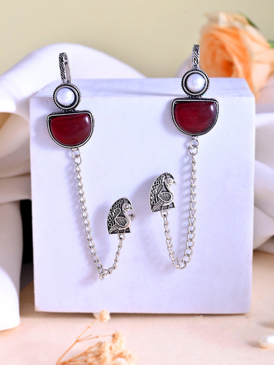Classic Oxidised Silver Long Chain Earrings With Red Stone For Women