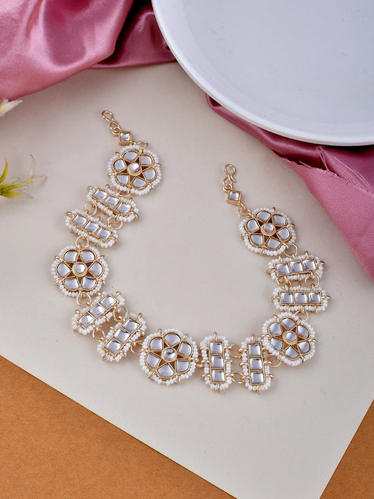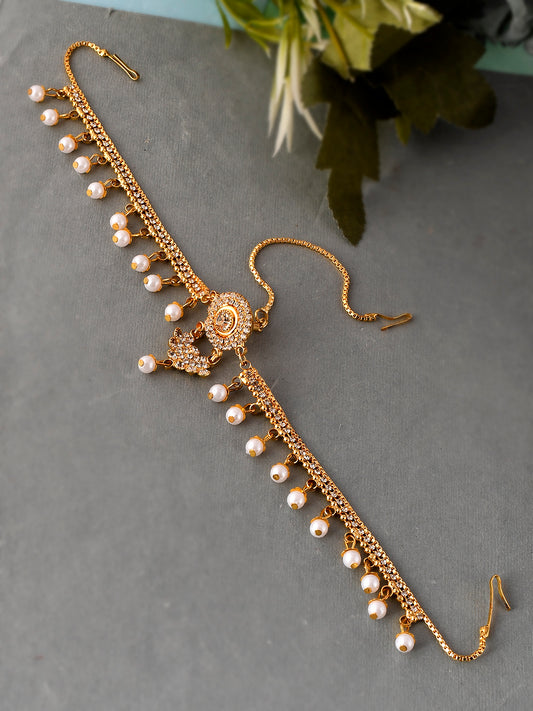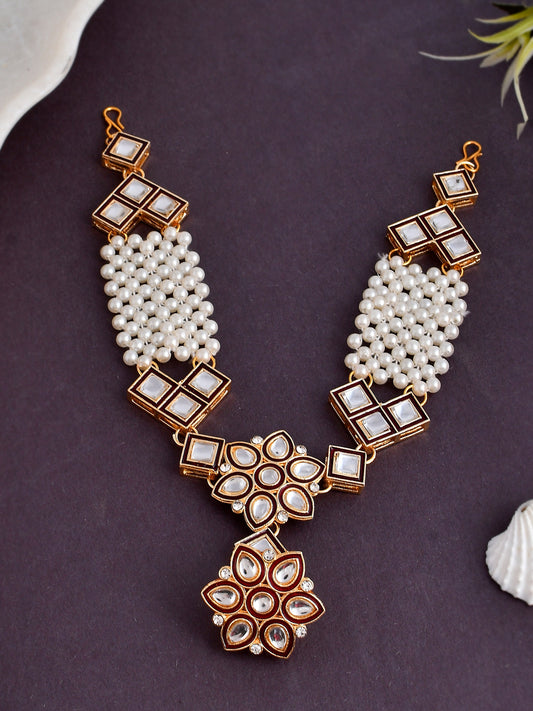 Gold Plated White Pearl Beaded Stone Studded Matha Patti | Head Jewellery