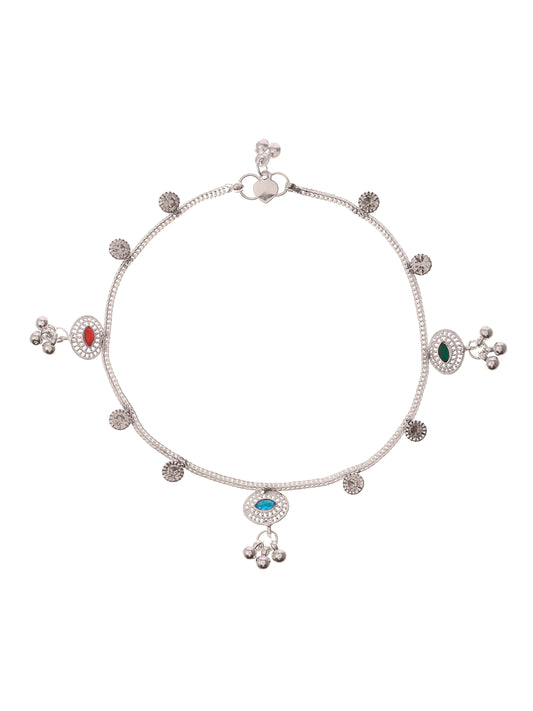 Multi Stone Silver Plated Anklet With Triple Toe Ring