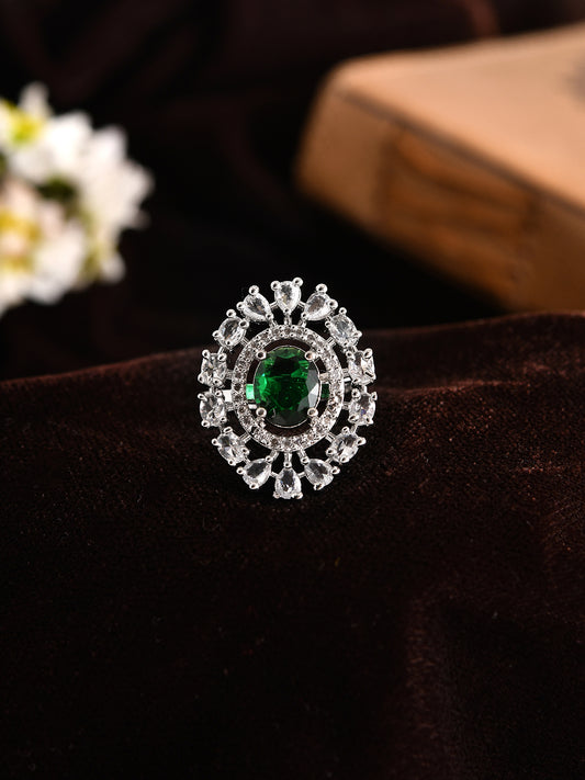 Silver Plated Green Amercian Diamond Adjustable Ring For Women