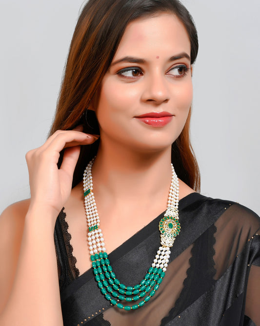 Kundan necklaces, which are popular for their organized manufacturing, are a key component of any Indian bridal look. A gold plated Kundan necklace includes carefully placed glass pieces with gold plating between the gems and their mount. It provides a beautiful and royal appeal perfect for weddings and official events.
