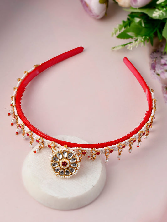 Gold Plated & Red Color Beaded Hair Band With Borla
