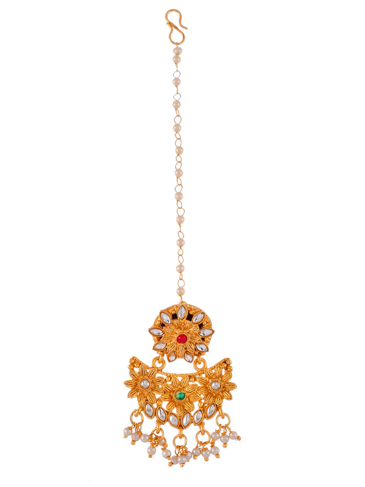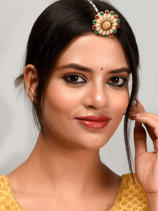 Gold Plated Kundan Studded & Pearl Beaded Maang Tikka For Women