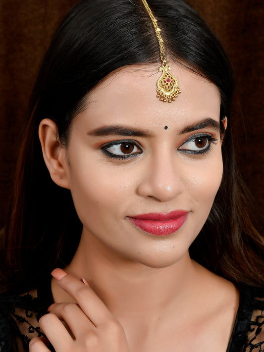 Gold Plated & Red Stone Handcrafted Maang Tikka Head Jewellery