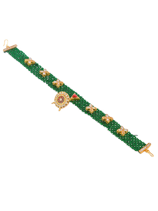 Mathapatti is a traditional Indian hair accessory that gracefully drapes across your forehead, adding an elegant touch to your look. In addition to this, it is a classic choice for special occasions like weddings.Rajputi rakhdi set is a must in rajput wedding jewellery. With beautiful design, it is often adorned with gemstones, pearls, and intricate details, making it a regal addition to any bridal outfit.