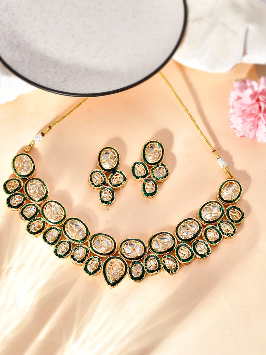 Gold Plated Pearl and Light Greeen Beads Studded Kundan Necklace Set For Women