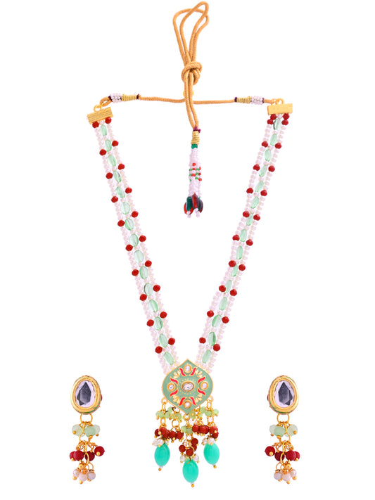 Kundan Pendant Green Bead Jewellery Set With Earrings
