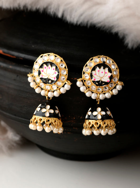 Gold & Black Toned Kundan Studded Handcrafted Floral Drop Earrings