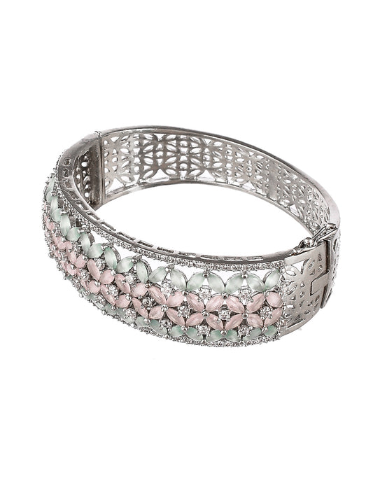 Green & Pink AD Stone Studded Traditonal Kada Silver Plated Bracelet
