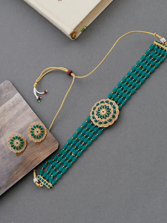 Gold Plated Green Bead Handcrafted Jewellery Set