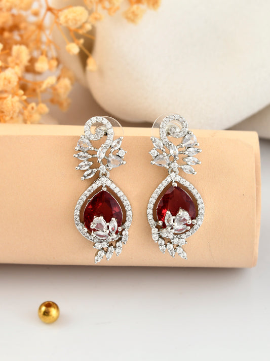 Trending Silver-Plated Red American Dimond Studded Drop Earrings