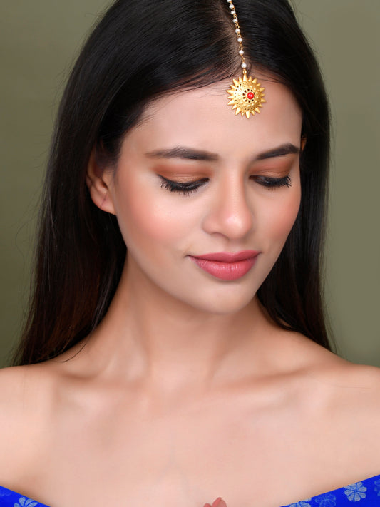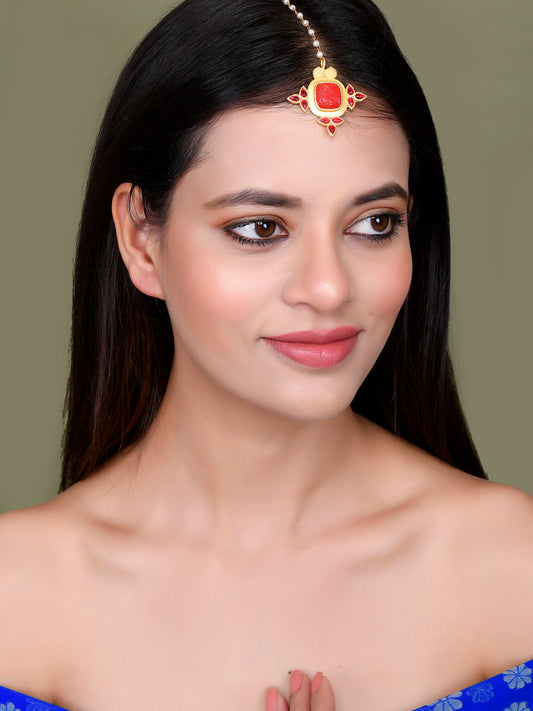 Gold Plated Red Floral Ethnic Maang Tikka