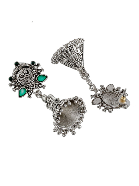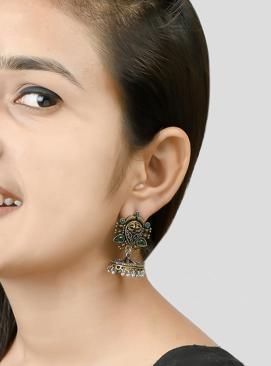 Green Stone Oxidised Silver Ethnic Jhumka Earrings