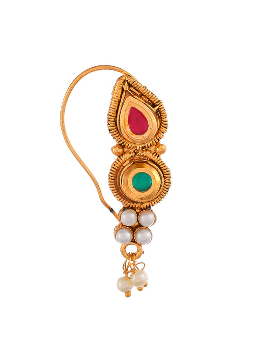 Gold Plated Red & Green Stone Studded Beaded Marathi Nosepin