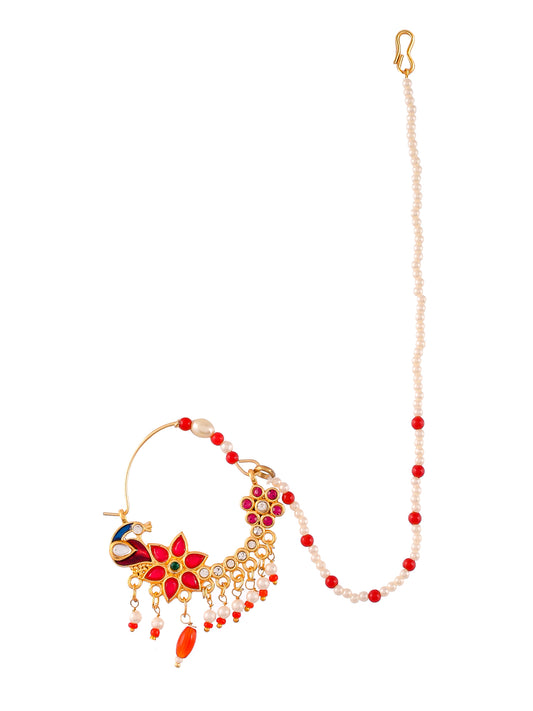 Gold Plated Stones & Pearl Beaded Mayur Nose Ring