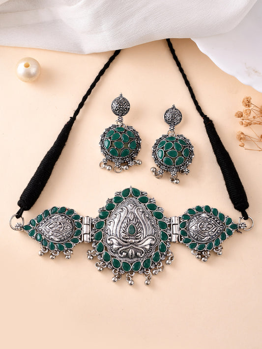 Ethnic Green Oxidized Silver Plated Temple Jewellery Set