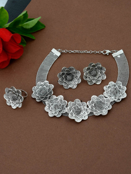 Rose Choker Silver Plated Necklace With Ring And Earrings| Jewellery Set For Women And Girl