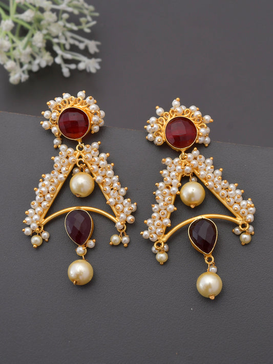Gold Plated Red Stone Studded Pearl Chandbali Earrings For Women