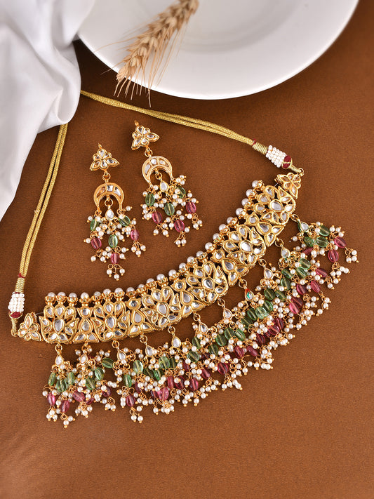 Trendy Kundan Gold Plated Wedding Pearl Choker Jewellery Set For Women