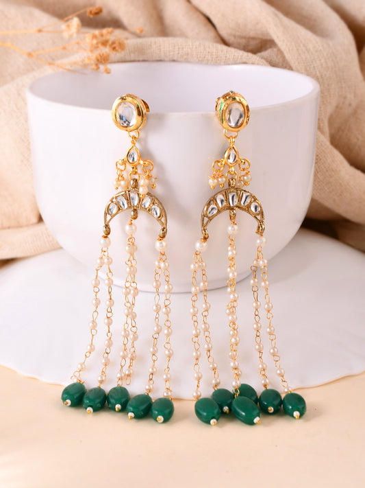 These earrings are a true masterpiece for those who appreciate opulence. Adorned with exquisite Kundan stones, these earrings exude regal grandeur. Make a statement at special occasions with these luxurious pieces.