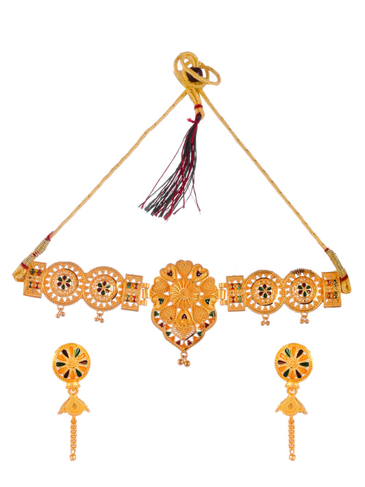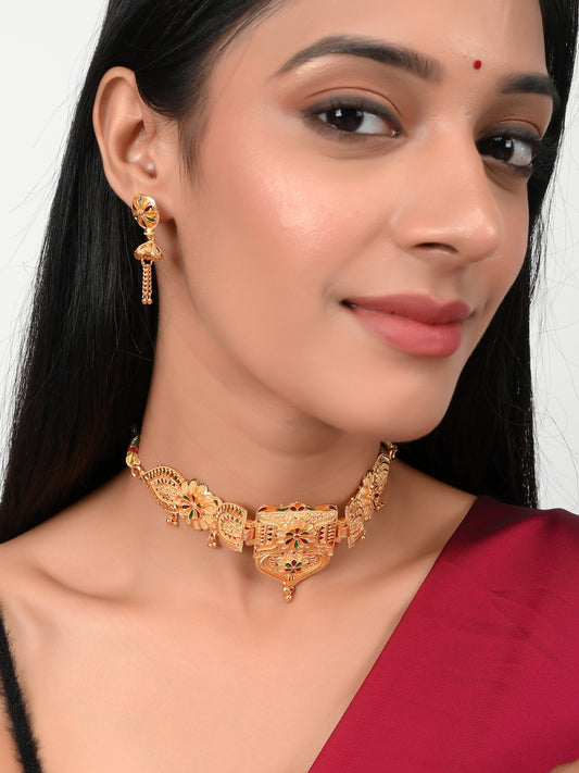 Gold Handcrafted Meenakari Floral Temple Jewellery Set For Women