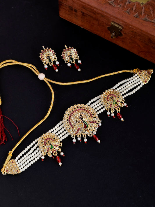 Gold Plated Pearl Kundan Peacock Brooch Jewellery Set For Women